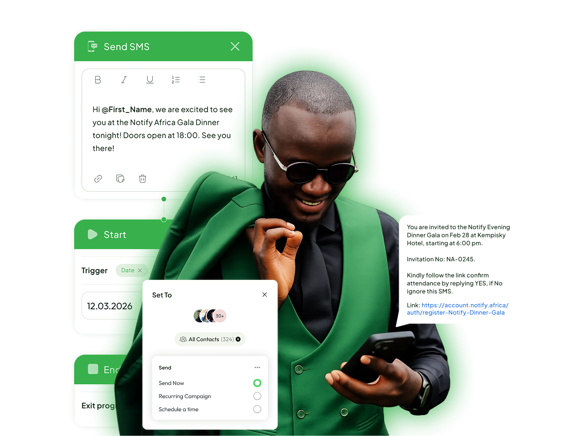 Notify Africa makes event communication faster, easier, and more effective. Improve guest experience, streamline operations, and boost attendance with powerful, event-focused SMS tools.