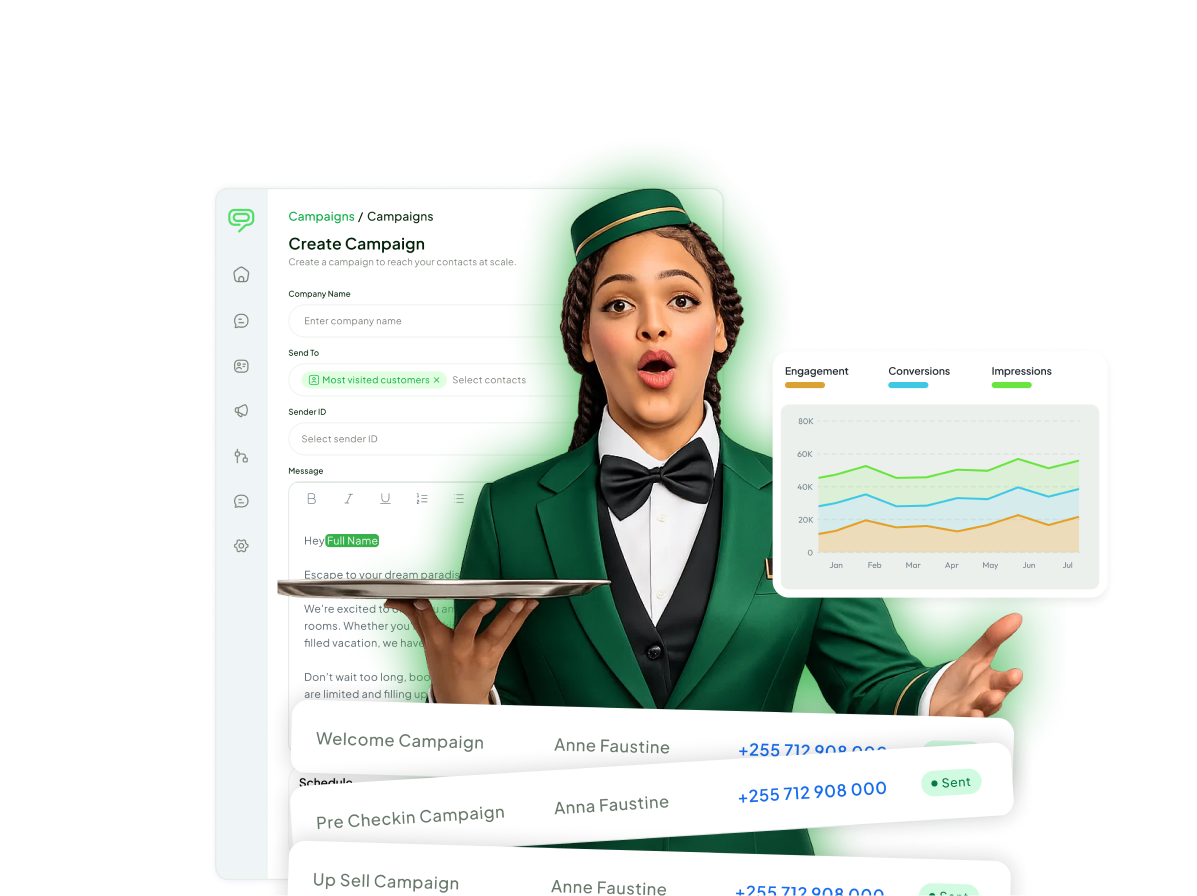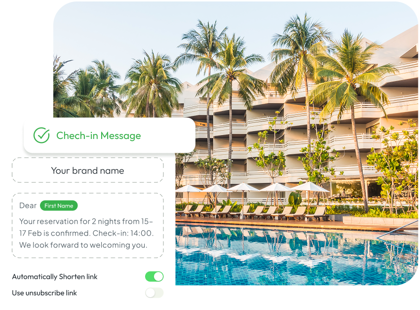 Send instant booking confirmations, check-in reminders, promotional offers, and guest notifications in seconds — with 99.9% delivery rates and 24/7 support.
