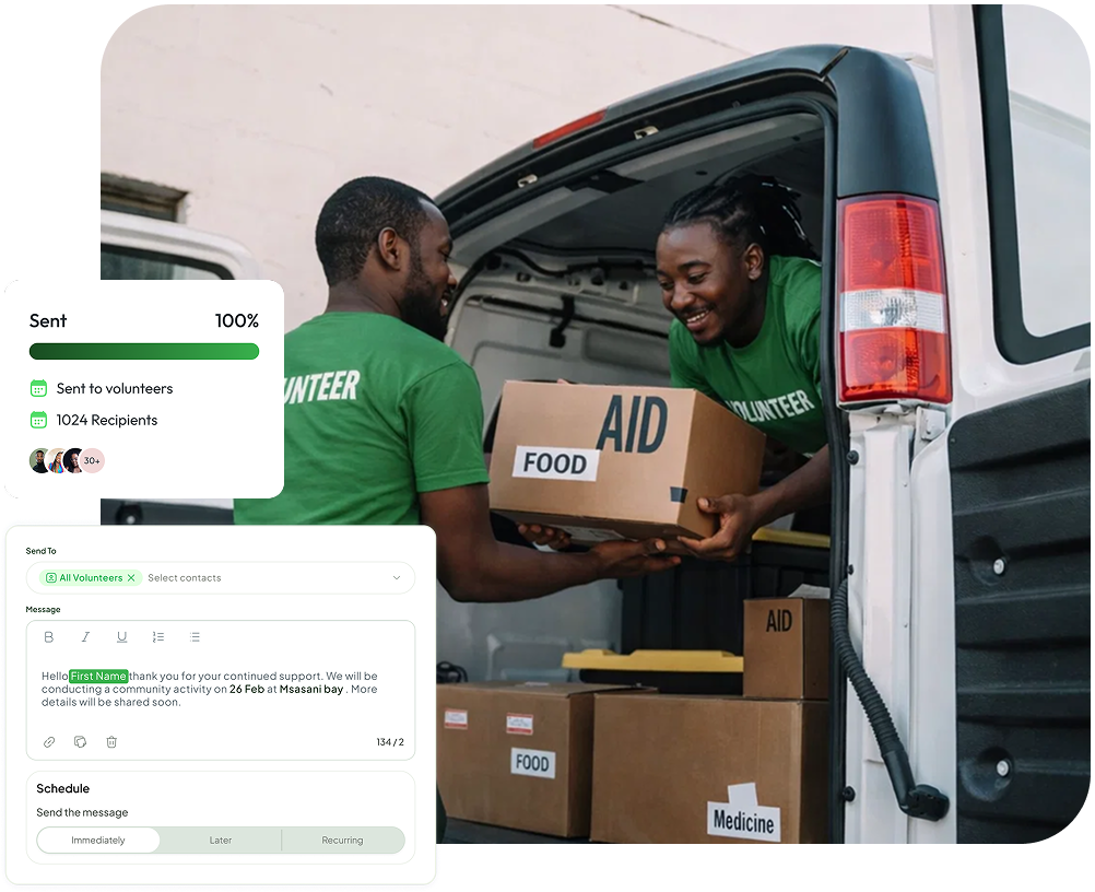 Reach volunteers, field teams, donors, and beneficiaries across Tanzania with fast, affordable bulk SMS built for NGOs.